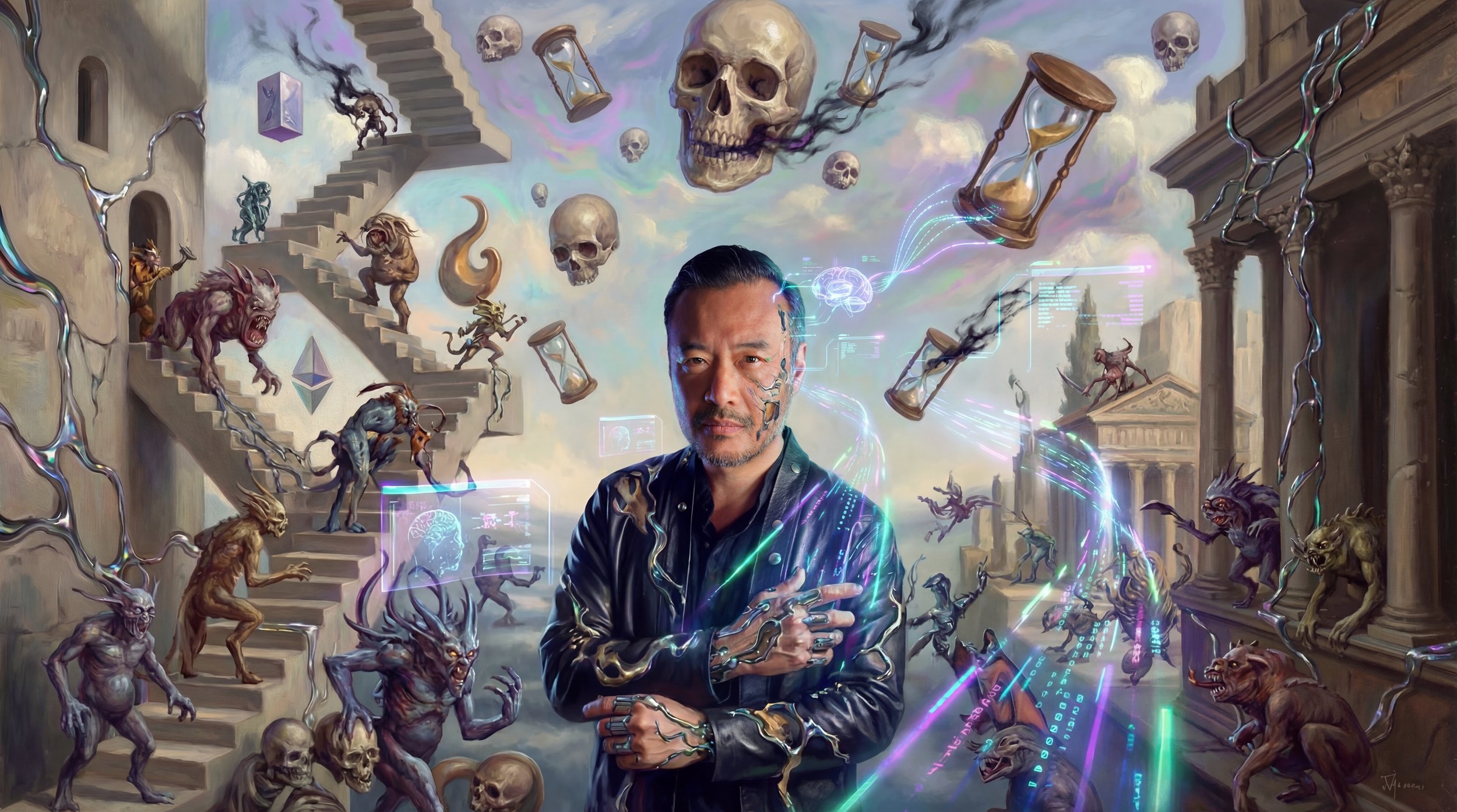 A surreal short generated entirely through Google Flow, using one photo—my LinkedIn profile—as the only identity reference across wildly different aesthetics (cyberpunk, classical meets sci-fi, horror, video game).